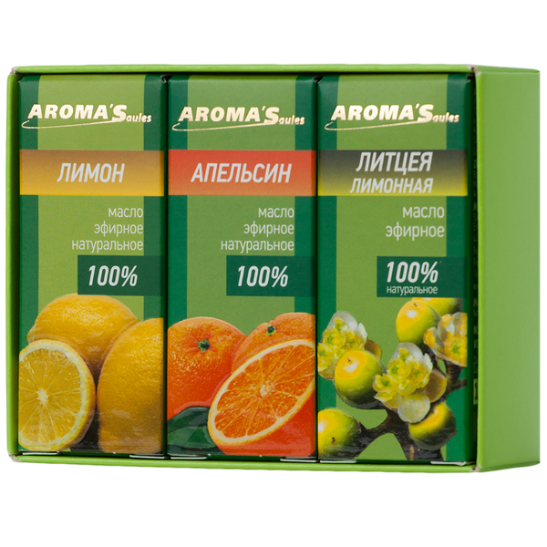 Набор состоит из натуральных эфирных масел Апельсина, Лимона, Литцеи лимонной.