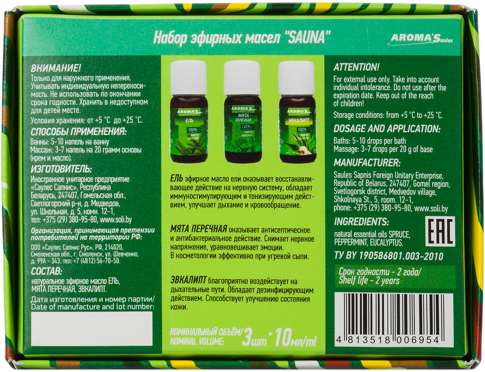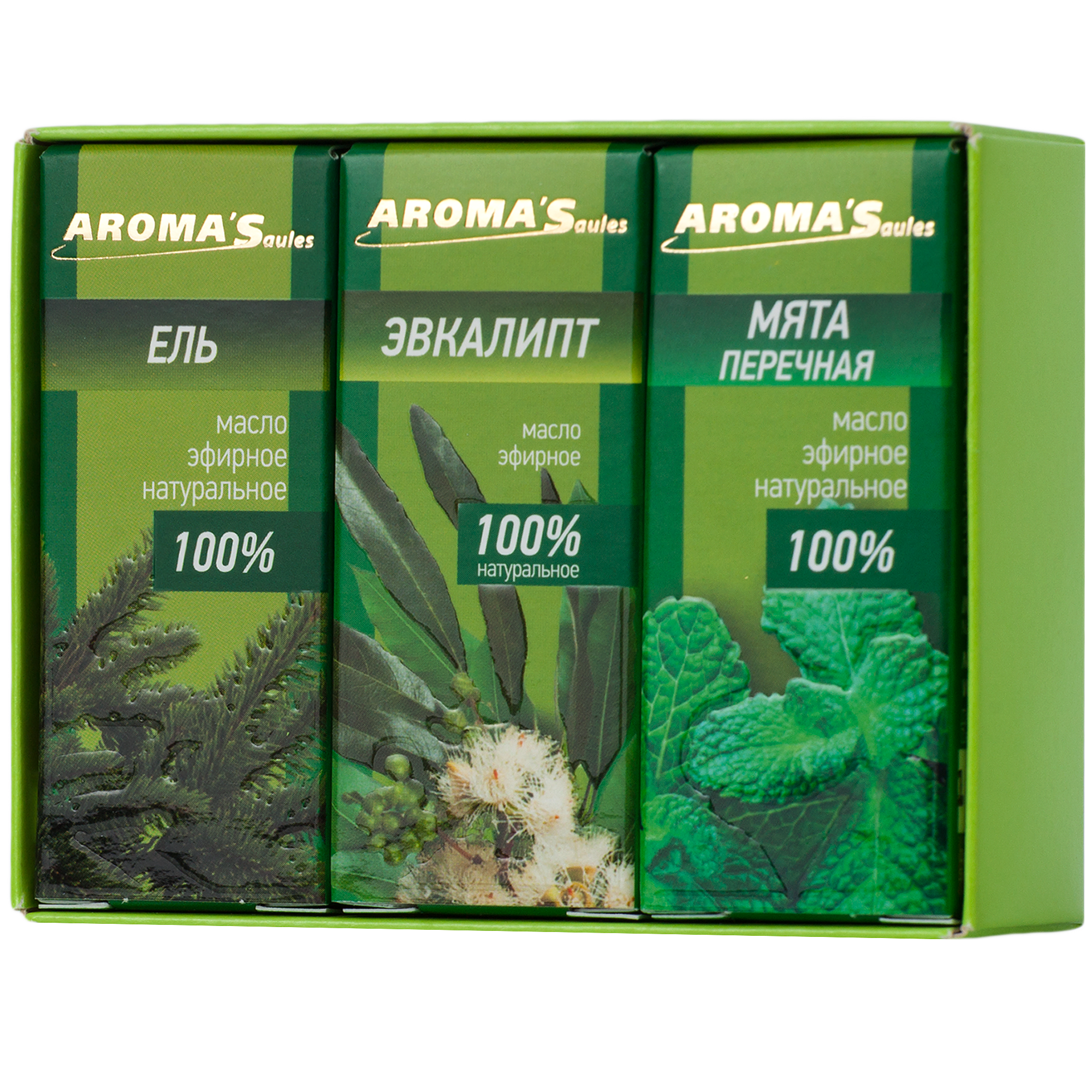 Набор состоит из натуральных эфирных масел Эвкалипта, Ели, Мяты перечной.