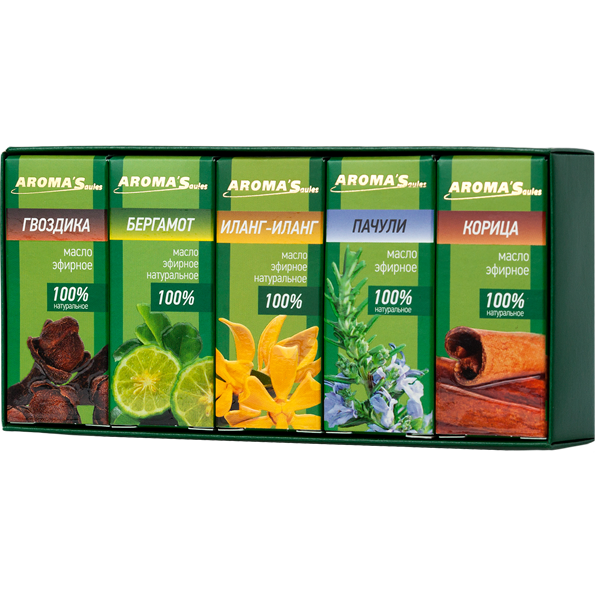 Набор состоит из эфирных натуральных масел Пачули, Иланг-иланга, Бергамота, Корицы, Гвоздики.
