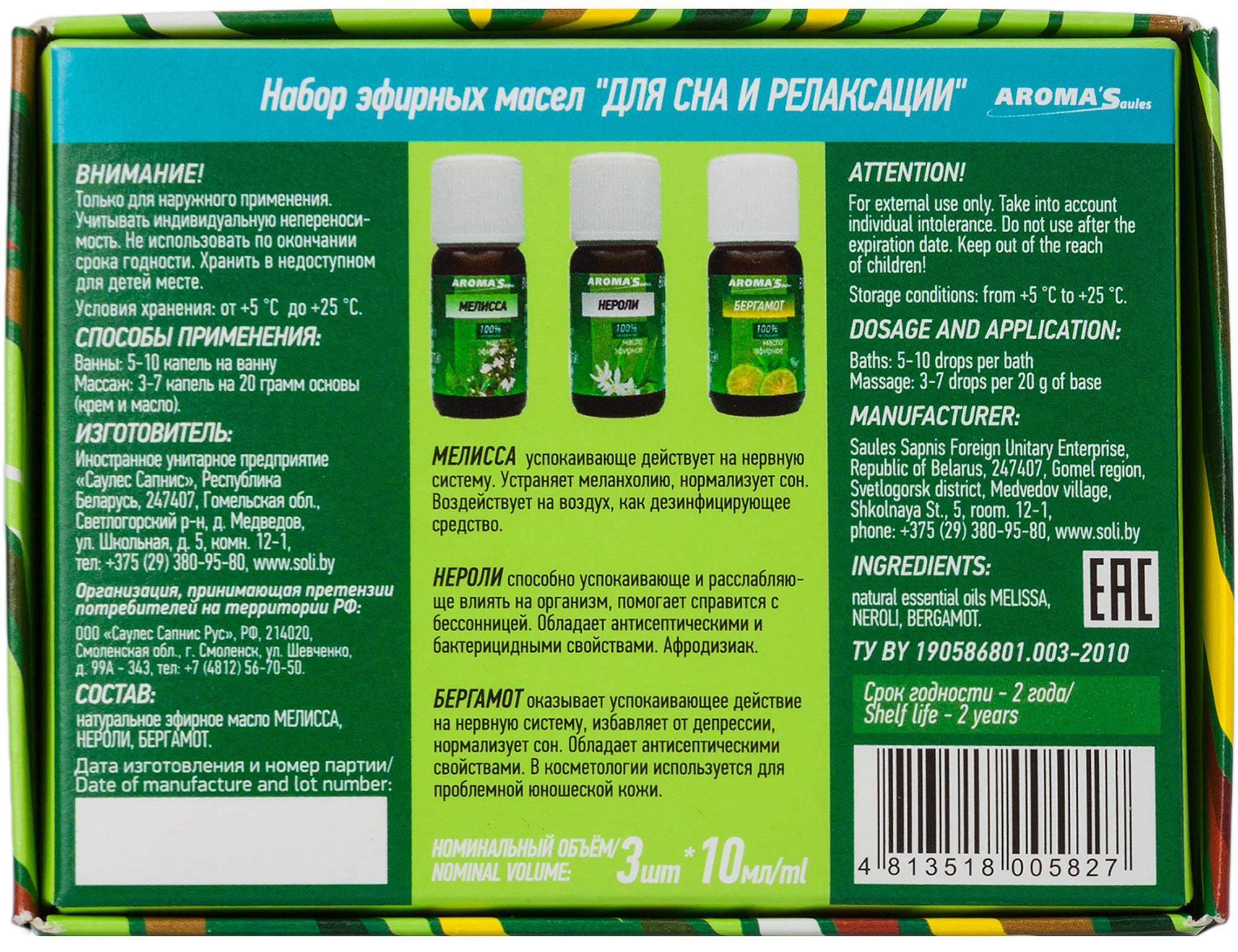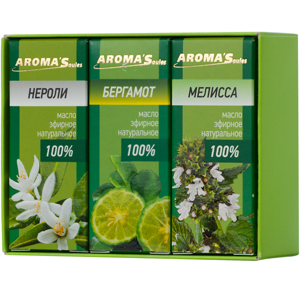 Набор состоит из натуральных эфирных масел Бергамота, Мелиссы, Нероли.