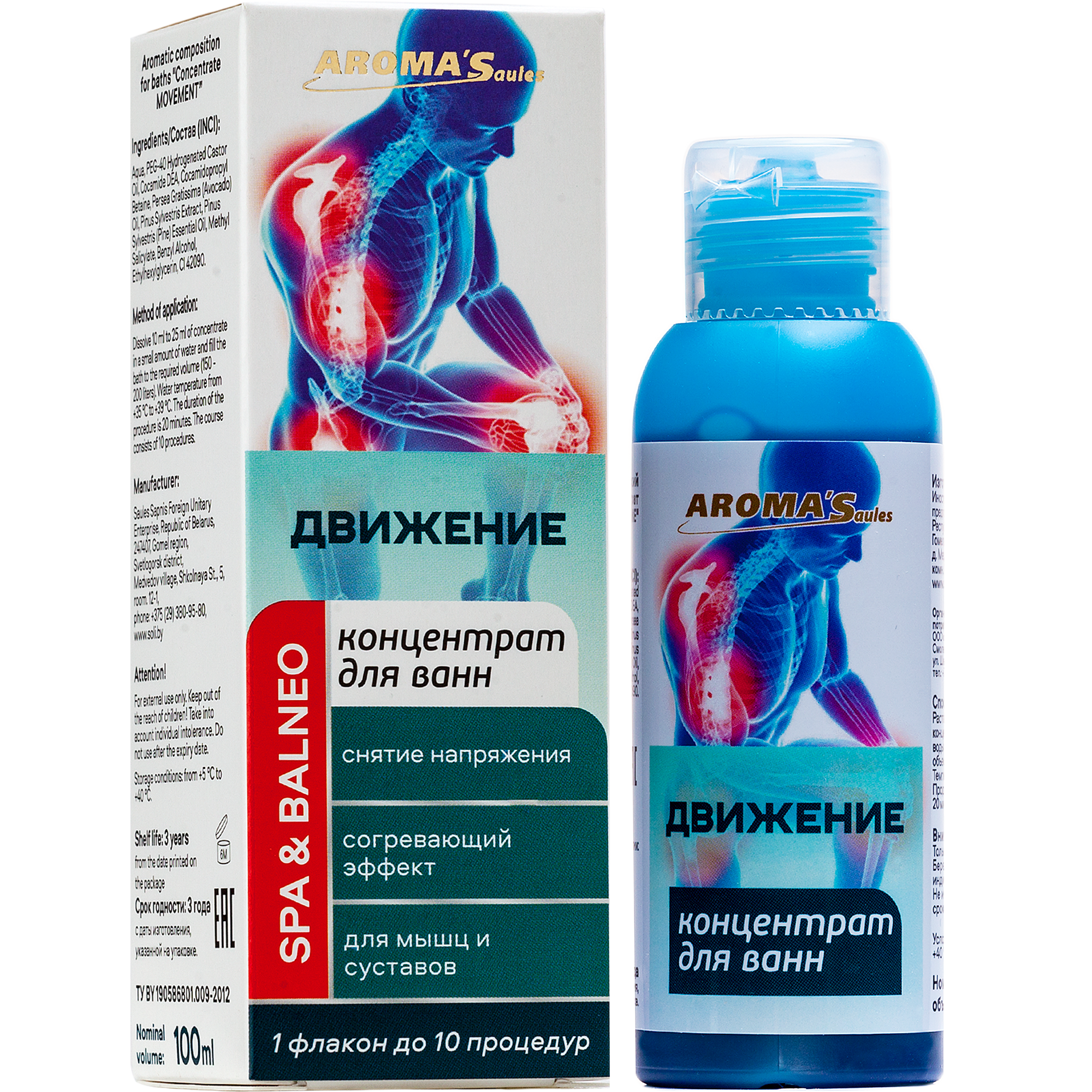 Жидкий концентрат для ванн "Движение" Действующими активными компонентами данного концентрата являются метилсалицилат, эфирное масло сосны, экстракт сосновых почек и растительное масло авокадо. Основное комплексное действие концентрата направлено на улучшение состояния опорно-двигательного аппарата и улучшения состояния кожных покровов