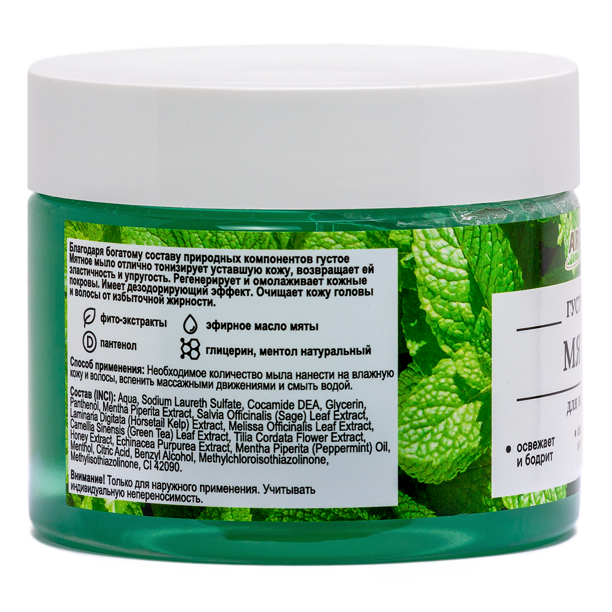 Благодаря богатому составу природных компонентов густое Мятное мыло бережно ухаживает за кожными покровами, очищает и возвращает здоровый вид коже и волосам.
