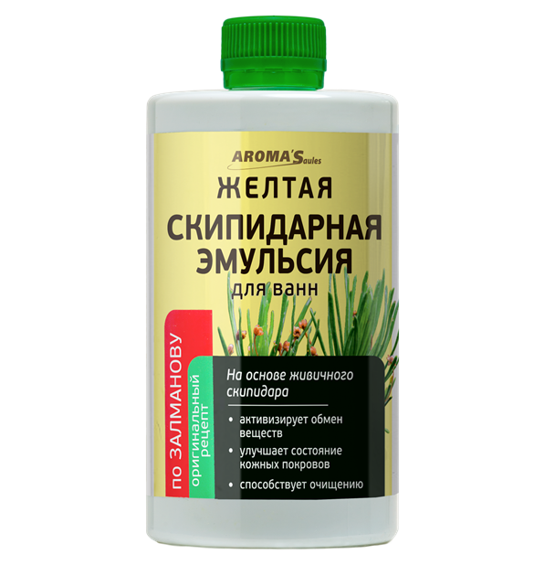 Желтая скипидарная эмульсия для ванн применяется в качестве вспомогательного средства для оздоровления и восстановления работы организма. Живичный скипидар положительно воздействует на кровеносные капилляры и сосуды, улучшает кровоток в органах и тканях, оказывает болеутоляющее, спазмолитическое, противовоспалительное, регенерирующее действие. Благодаря повышению внутриклеточной температуры и активной стимуляции потоотделения,